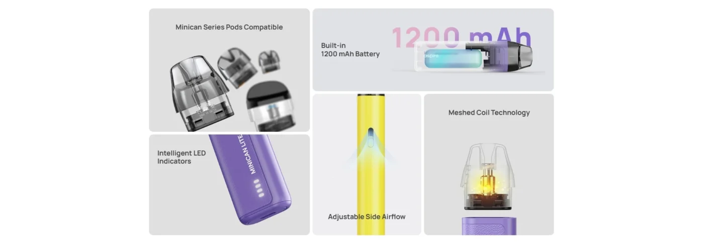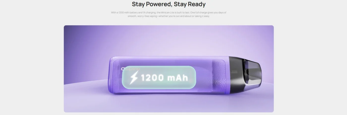 Το Aspire Minican Lite διαθέτει ισχυρή ενσωματωμένη μπαταρία 1200mAh, που προσφέρει μεγάλη αυτονομία για αδιάκοπη χρήση όλη την ημέρα. Φορτίζει γρήγορα μέσω θύρας Type-C, ώστε να έχετε τη συσκευή σας έτοιμη σε ελάχιστο χρόνο.