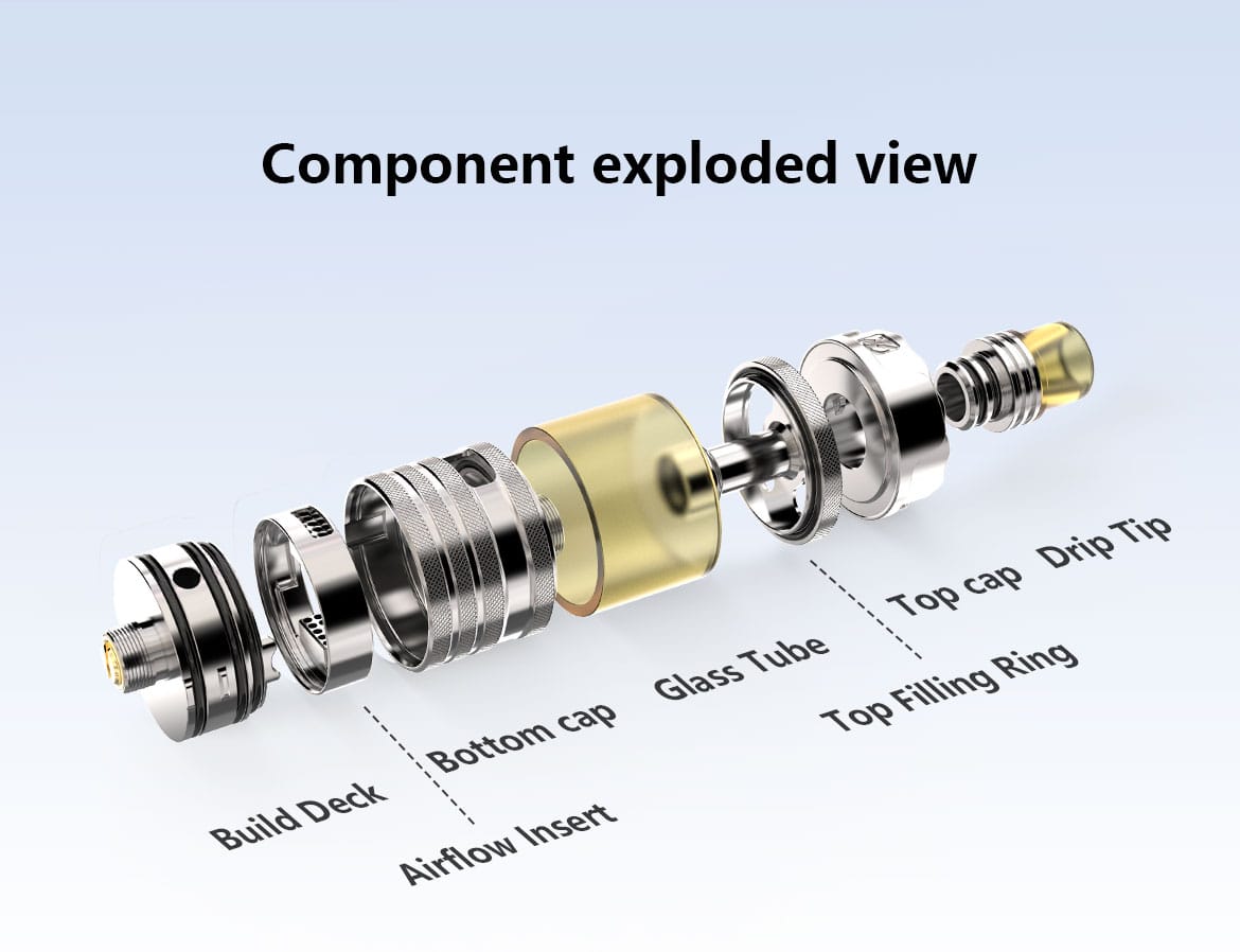 Το μονό postless deck του Precisio GT RTA διευκολύνει το “στήσιμο” του , κάνοντας το μια απλή διαδικασία. Μπορείτε επίσης να προσαρμόσετε τη ροή του αέρα με ακρίβεια. Η εισαγωγή του αέρα του καλύπτει ένα ευρύ φάσμα από RDL (Restricted Direct Lung) έως DL (Direct Lung). Διαθέτει βίδες τιτανίου και μια πιο κλειστή καμπάνα, που αυξάνει την απόδοση στις γεύσεις των υγρών αναπλήρωσης, εξασφαλίζοντας μια απόλυτα ικανοποιητική ατμιστική εμπειρία. Το σύστημα τροφοδοσίας με “βαρύτητα” εξασφαλίζει την απρόσκοπτη ροή του υγρού προς το βαμβάκι, για να απολαμβάνετε κάθε σταγόνα αγαπημένου υγρού αναπλήρωσης.