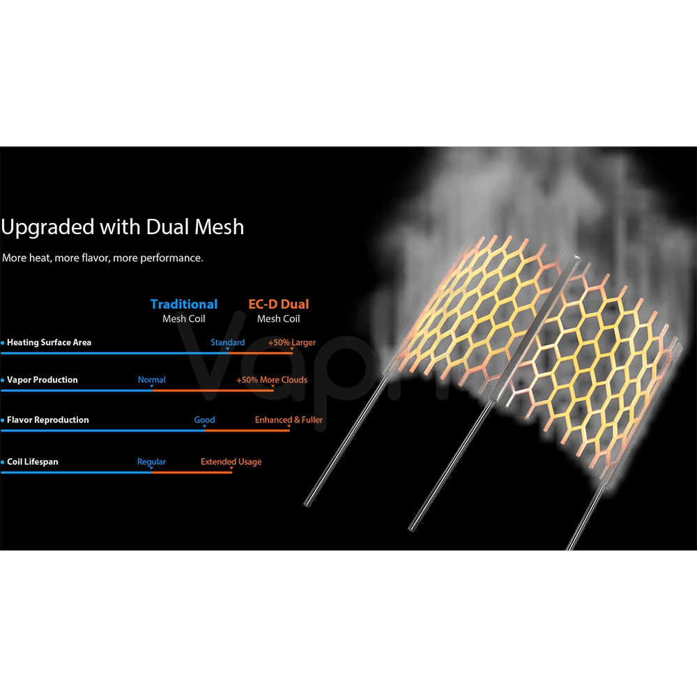 Ο ατμοποιητής Eleaf Melo X διαθέτει δύο από τις νέες αντιστάσεις EC-D Dual Mesh: μια αντίσταση 0,5 ohm (15-25 W) για χαλαρό άτμισμα και μια αντίσταση 0,3 ohm (30-45 W) για πυκνότερα σύννεφα ατμίσματος με ακόμα πιο δυνατή γεύση. Χάρη στη μεγάλη επιφάνεια πλέγματος, αυτές οι αντιστάσεις προσφέρουν συνεπή ατμοποίηση, εκτεταμένη διάρκεια ζωής και εξαιρετική αναπαραγωγή γεύσης. Εκτός από τις αντιστάσεις EC-D, ο Melo X είναι επίσης συμβατός με ολόκληρη την οικογένεια αντιστάσεων EC (EC-A, EC-2, EC-M, EC-N) – για μέγιστη ευελιξία και ποικιλία.