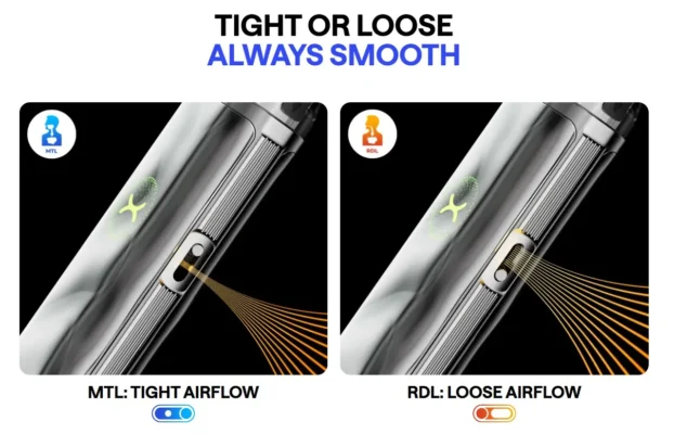 Με το ρυθμιζόμενο airflow slider, προσαρμόζεις την τζούρα στα γούστα σου, από πιο σφιχτή MTL εμπειρία μέχρι πιο αεράτη RDL αίσθηση.