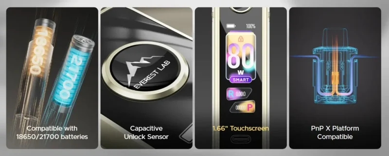 Λειτουργεί με μία μπαταρία 18650 ή 21700 (δεν περιλαμβάνεται) και αποδίδει ισχύ από 5 έως 80W, προσαρμόσιμη ανάλογα με τις προτιμήσεις του χρήστη.
