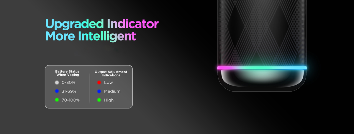 Πατήστε γρήγορα το κουμπί 3 φορές για εναλλαγή μεταξύ Χαμηλό (Κόκκινο), Μεσαίο (Μπλε) και Υψηλό (Πράσινο) για να προσαρμόσετε εύκολα την ένταση της ισχύς για διαφορετικά επίπεδα ροής αέρα και να απολαύσετε διάφορες γεύσεις.